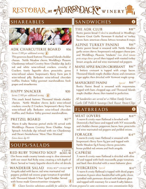 The Restobar at Adirondack Winery is your go-to spot for delicious food, craft drinks, and good vibes all in one place! Located at our Queensbury Tasting Room at 395 Big Bay Road, it's more than a winery. We use the best local ingredients made by craft producers like us to serve up tasty shareables like charcuterie and pretzel boards, plus flatbreads, sandwiches, soups, salads, desserts, a kids menu, and a delicious Sunday Brunch!