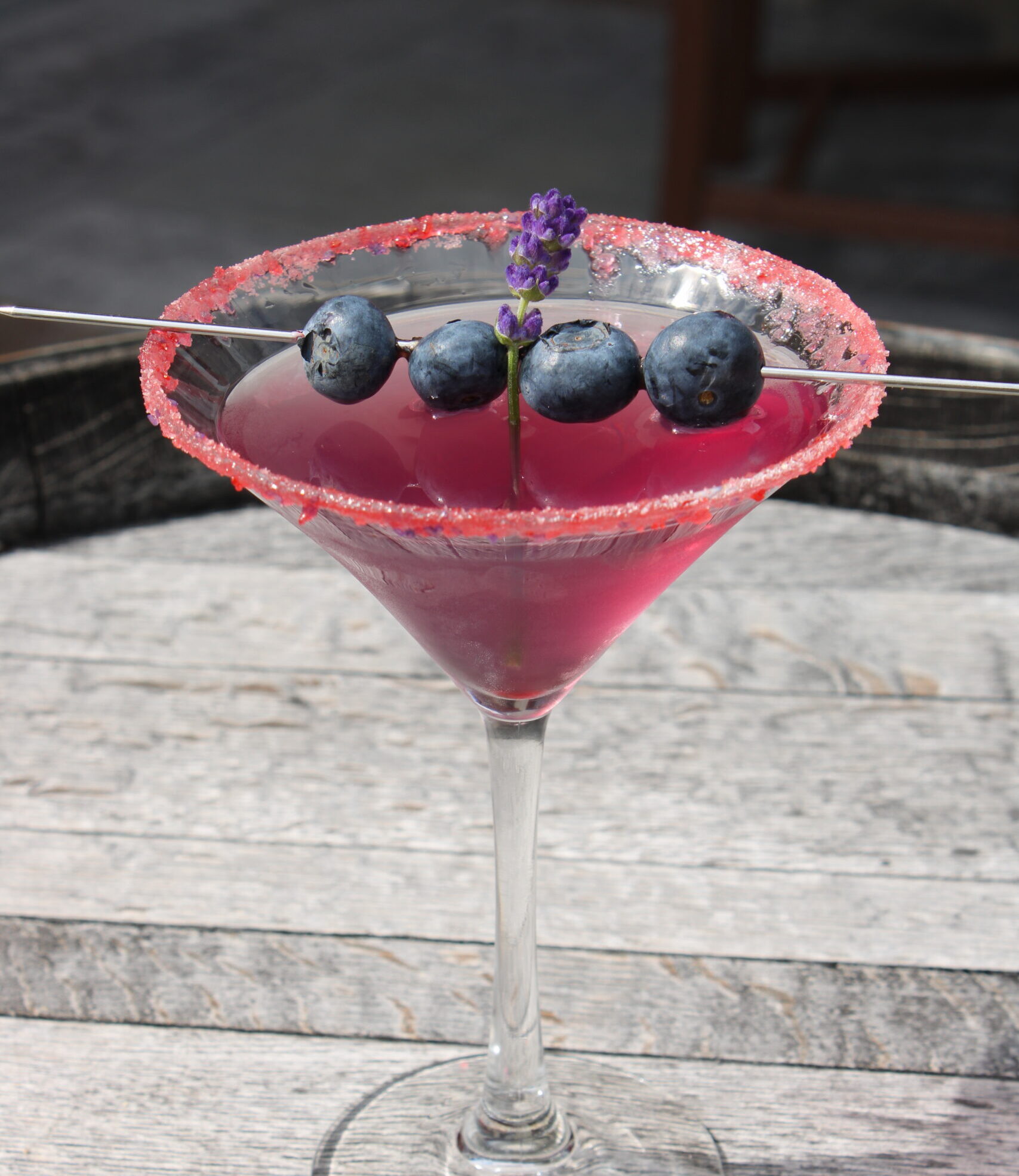 - Rim a chilled martini glass with pink berry sugar