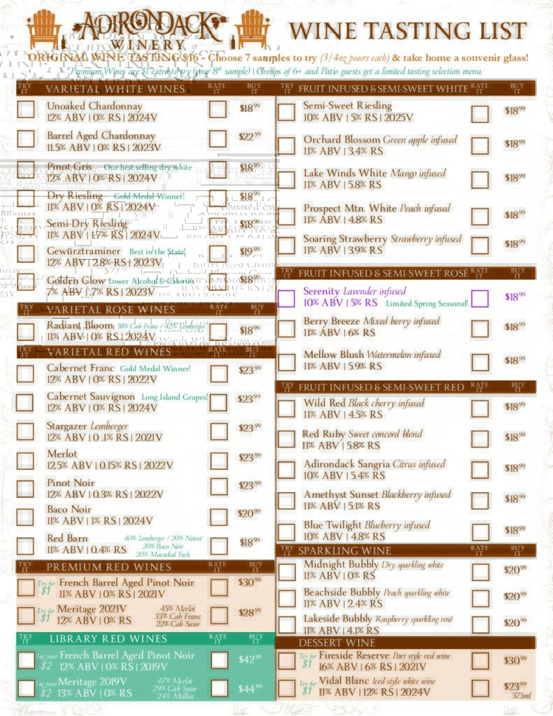 Your experience at Adirondack Winery isn’t complete without trying our wines! Did you know we are one of the largest wineries in New York, producing about 20,000 cases annually of award-winning dry red and white wines, and unique fruit infused wines? With over 35 wines to choose from, you’re sure to find one you love! Give our guided Wine Tasting Experience a try (you get to sample 7 wines for only $16 and take home a souvenir glass), or enjoy a flight of 4 wines or a simple glass of wine! Walk-ins are welcome, but reservations are an option, too>>